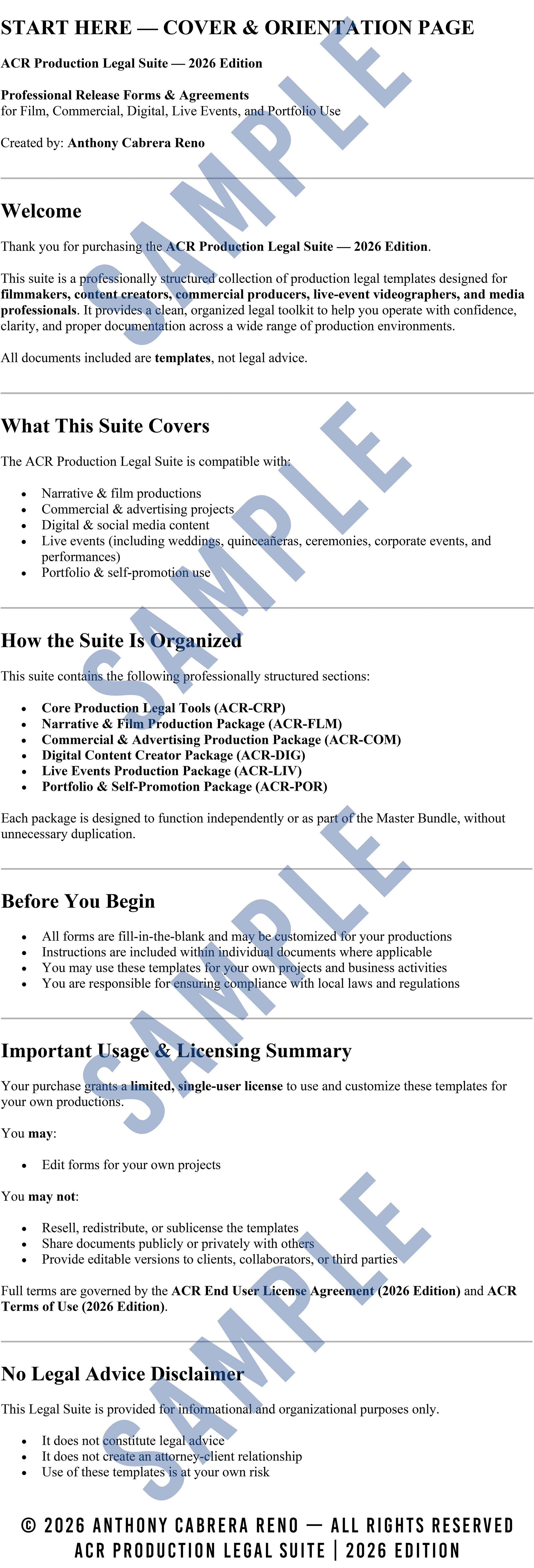 The ACR Production Legal Suite is a curated set of legal documents created specifically for independent filmmakers, content creators, and event producers.